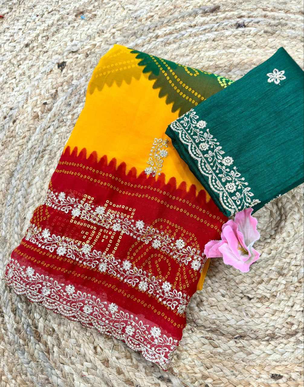 PIYU P1052 LEHERIYA BANDHANI-1 Yellow-Red Saree
